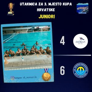 Taj potez se pokazao presudnim u sutrašnjoj utakmici za 3.mjesto, protiv splitskog Jadrana, jer su naši igrači u utakmicu ušli puno odmorniji od vršnjaka iz Jadrana koji su imali tešku utakmicu protiv Primorja. Iako je Jadran krenuo u utakmicu sa vodstvom od 3:1, naši momci pokazali su izrazitu srčanost te svojim zalaganjem stigli i na kraju prestigli taj rezultat. Finalnom pobjedom u utakmici za broncu, uspješno smo završili turnir Kupa Hrvatske.